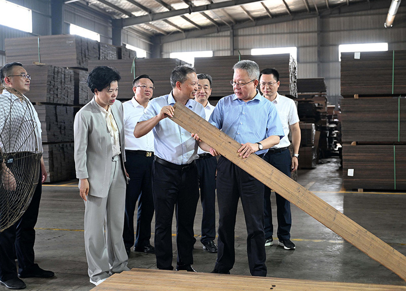 2025年6月16日,省政協(xié)副主席虢正貴來湖南桃花江竹材科技股份有限公司調(diào)研生態(tài)資源轉(zhuǎn)化與特色產(chǎn)業(yè)融合發(fā)展。公司董事長、省人大代表薛志成陪同并介紹情況。虢正貴充分肯定了桃花江竹材在竹資源利用及竹特色產(chǎn)業(yè)融合發(fā)展所取得的成果,他鼓勵企業(yè)繼續(xù)發(fā)揮龍頭優(yōu)勢,充分利用好桃江資源稟賦和產(chǎn)業(yè)優(yōu)勢,深化產(chǎn)學研融合,提升竹產(chǎn)業(yè)附加值,為民族地區(qū)生態(tài)資源高效轉(zhuǎn)化和特色產(chǎn)業(yè)融合發(fā)展探索更多經(jīng)驗。
